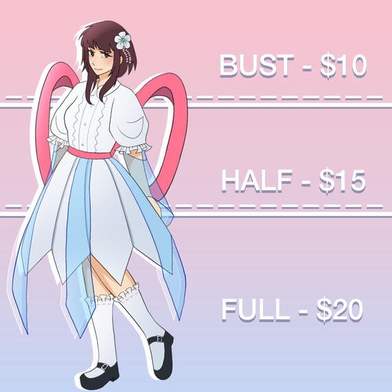 - The time range for completed commissions is anywhere between 3 days to 3 weeks! If any delays occur, I will let you know.- I will always show you a sketch preview! For more complicated work, I will show you lined or flat coloured previews. Let me know any changes that you want to be made.